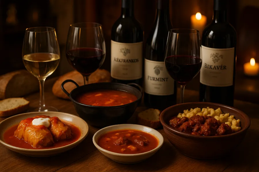 - Fűszeres vörösek (Kadarka, Kékfrankos): játékosan harmonizálnak a káposztás és húsos fogásokkal.