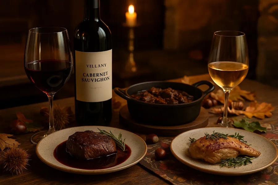 - Szarvas steakhez villányi Cabernet Sauvignon – telt test, erőteljes tanninok, hosszú, elegáns lecsengés.